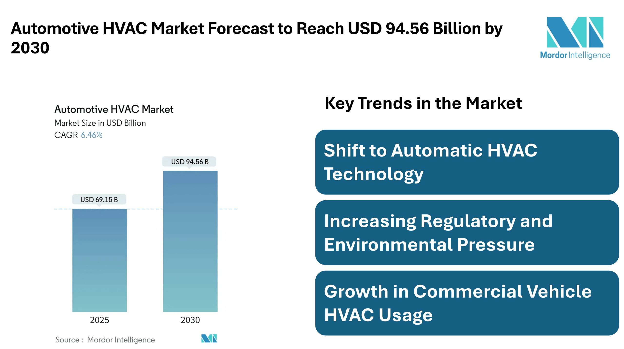 The latest research by Mordor Intelligence shows that the Automotive HVAC Market Size is projected to grow from approximately USD 69.15 billion in 2025 to USD 94.56 billion by 2030, at a compound annual growth rate of about 6.46 %. This growth reflects a recovering global automotive industry and increasing consumer expectations around comfort, efficiency, and air quality inside vehicles. The data covers both Passenger Cars and Commercial Vehicles segments across major regions, including North America, Europe, Asia-Pacific, South America, and Middle East & Africa.