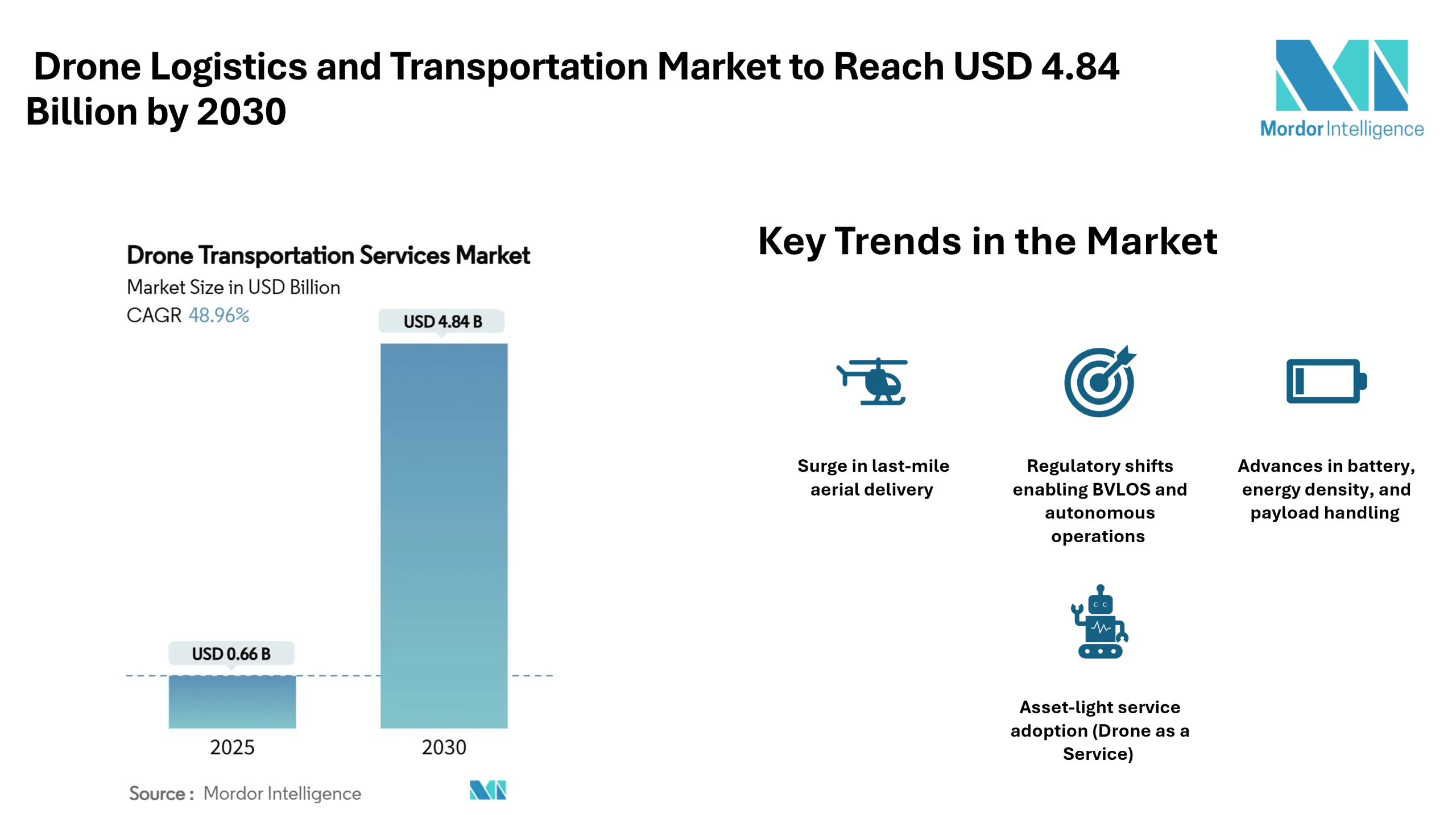 The drone logistics and transportation market is poised for rapid expansion over the next half decade. With a forecasted market value reaching USD 4.84 billion by 2030, the sector’s growth will be steered by evolving regulation, improving battery and propulsion technologies, and growing verticals in retail and healthcare. The increasing emphasis on Drone-as-a-Service models will further democratize access to aerial logistics.