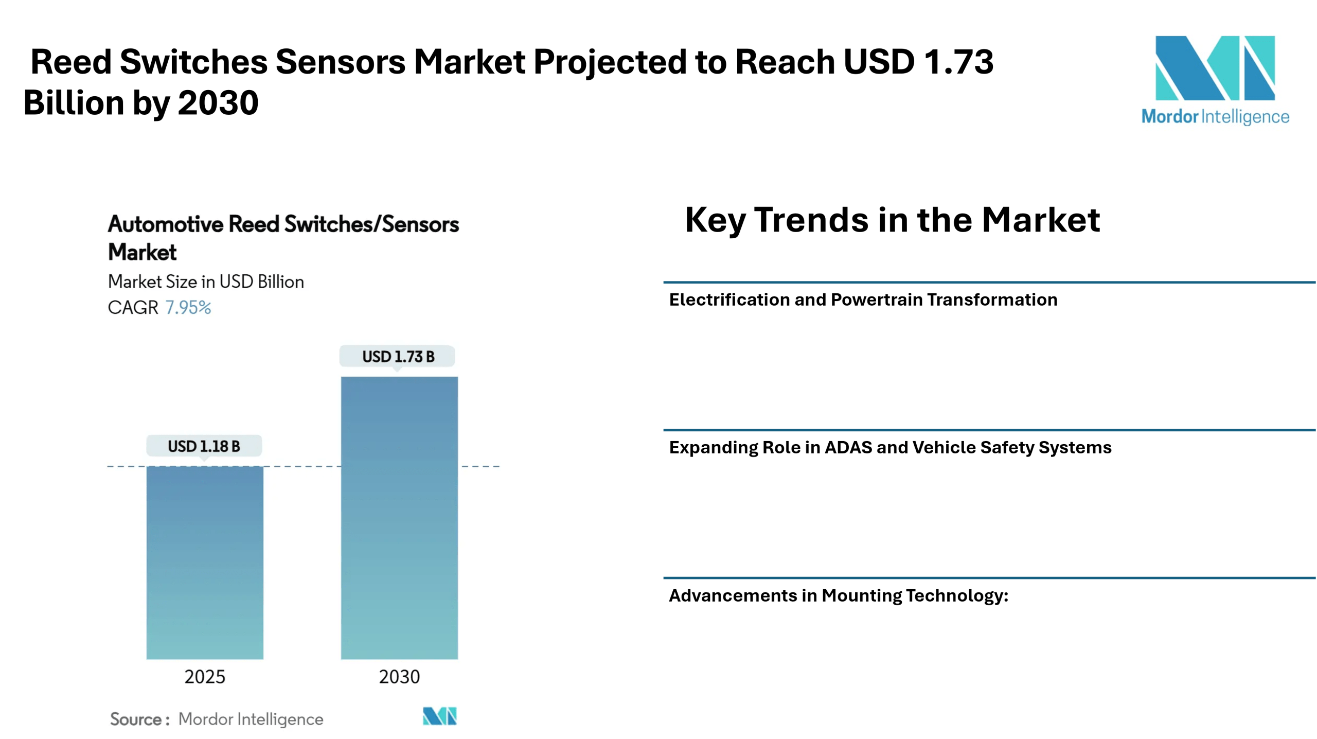 The automotive reed switches/sensors market size is valued at USD 1.18 billion in 2025 and is projected to hit USD 1.73 billion by 2030, advancing at a 7.95% CAGR during the forecast period. These figures reflect a growing demand for reliable, low-power sensing solutions across vehicle systems as manufacturers respond to regulatory mandates and electrification of transport. The market size and growth trajectory highlight the importance of reed switch technology as a critical component in next-generation automotive applications. With increasing focus on battery management, safety systems, and compact electronic assemblies, the reed switches sensors market is positioned for steady expansion. Companies and industry stakeholders are now paying close attention to the reed switches sensors market size, share, and analysis in order to align product development and supply-chain strategies.