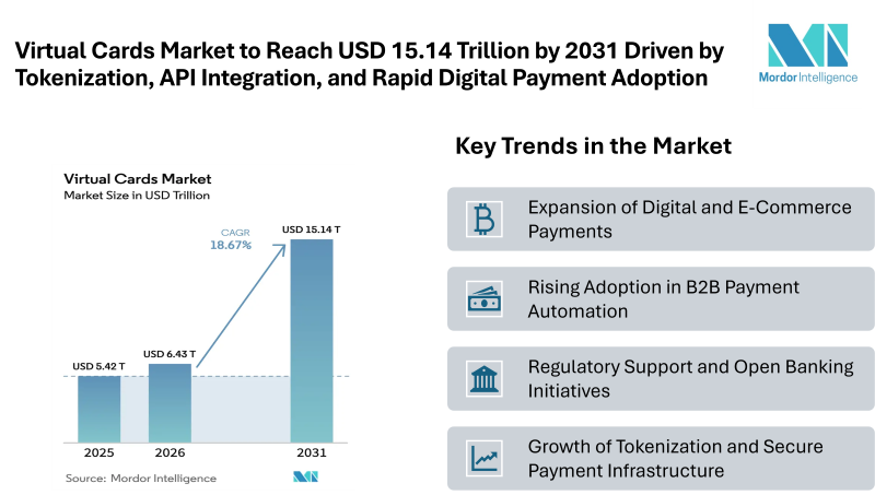 According to Mordor Intelligence, the virtual cards market size is expected to witness strong growth, expanding from USD 5.42 trillion in 2025 to USD 6.43 trillion in 2026, and reaching approximately USD 15.14 trillion by 2031. This reflects a robust compound annual growth rate of 18.67%. This rapid expansion is being fueled by the increasing convergence of payment systems and software platforms, enabling virtual cards to offer highly programmable and API-driven payment experiences. Innovations in tokenization are significantly enhancing transaction security, improving authorization rates, and reducing fraud across digital and in-app commerce environments. At the same time, the rise of open banking frameworks is streamlining funding and settlement processes by enabling standardized data sharing through APIs. Enterprises, particularly treasury departments, are accelerating adoption as virtual cards provide automated reconciliation, enhanced spend control, and improved working capital management.